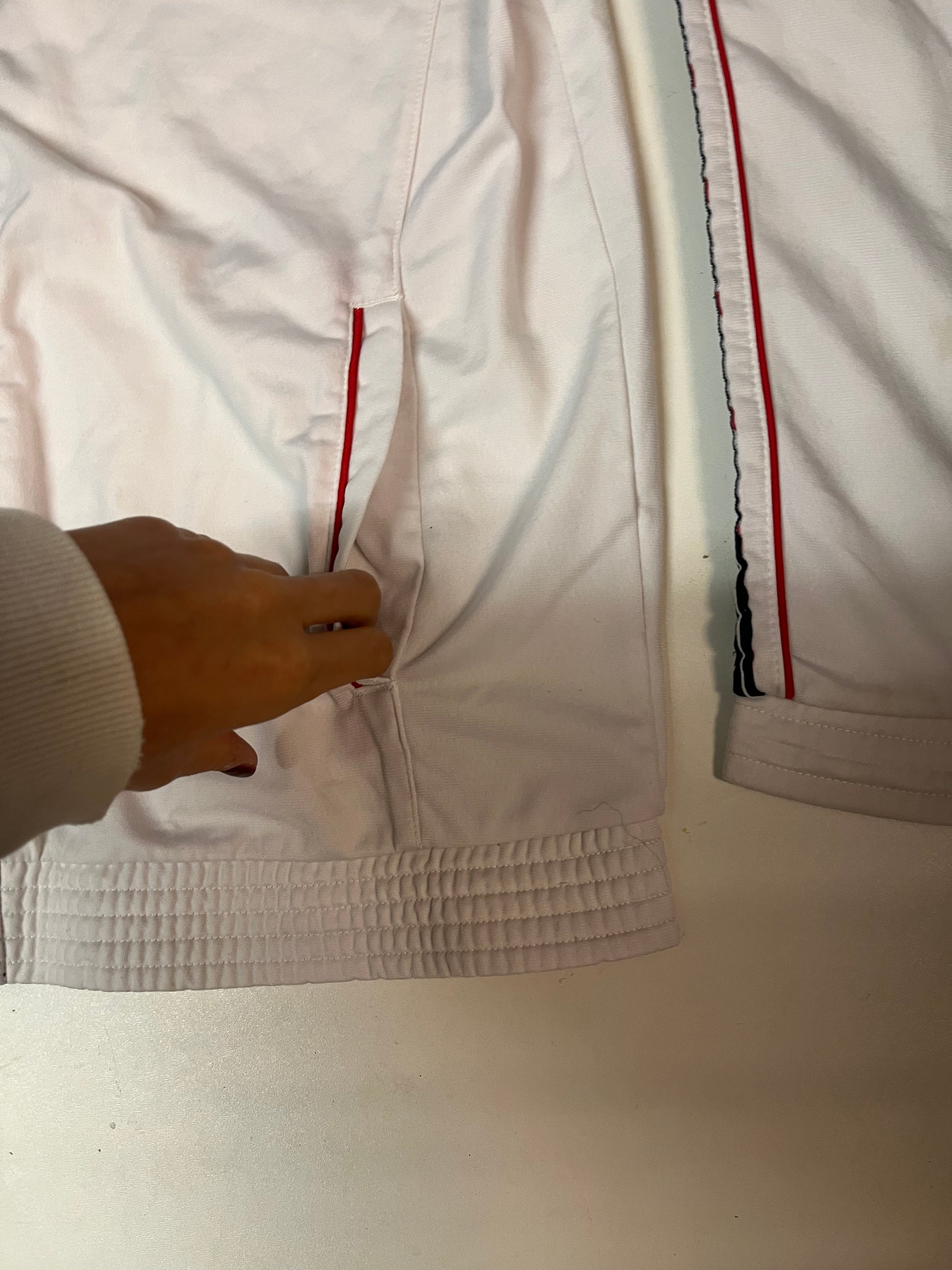 Die Breite der Trackpants kann mit dem Bändel in der Hose individuell verstellt werden.